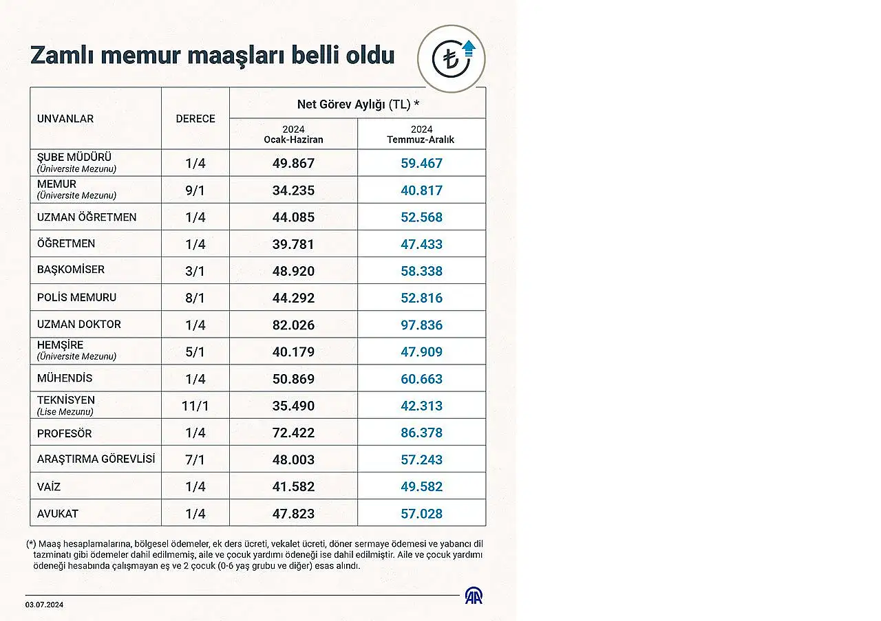 Bu artışlar neticesinde 2024 yılı temmuz dönemi itibarıyla bazı kamu görevlilerinin net görev aylığı şöyle belirlendi: